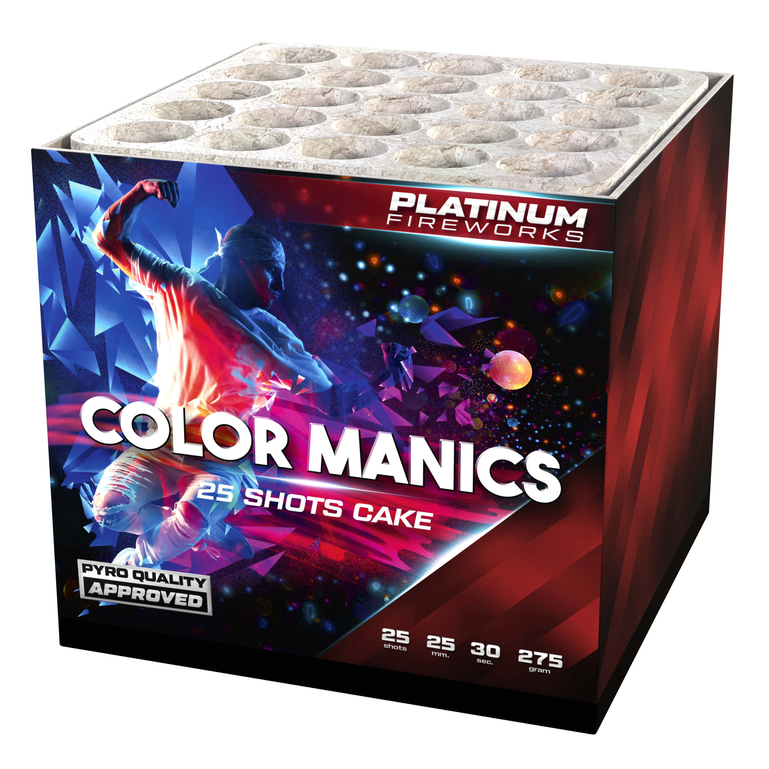Color Maniacs is perfect voor liefhebbers van tempo en kleur. Dankzij het middelgrote kaliber van 25mm krijg je mooie volle effecten zonder dat het product te groot of te zwaar wordt. Hij is eenvoudig af te steken, past in elke showopbouw en levert gegarandeerd spektakel.