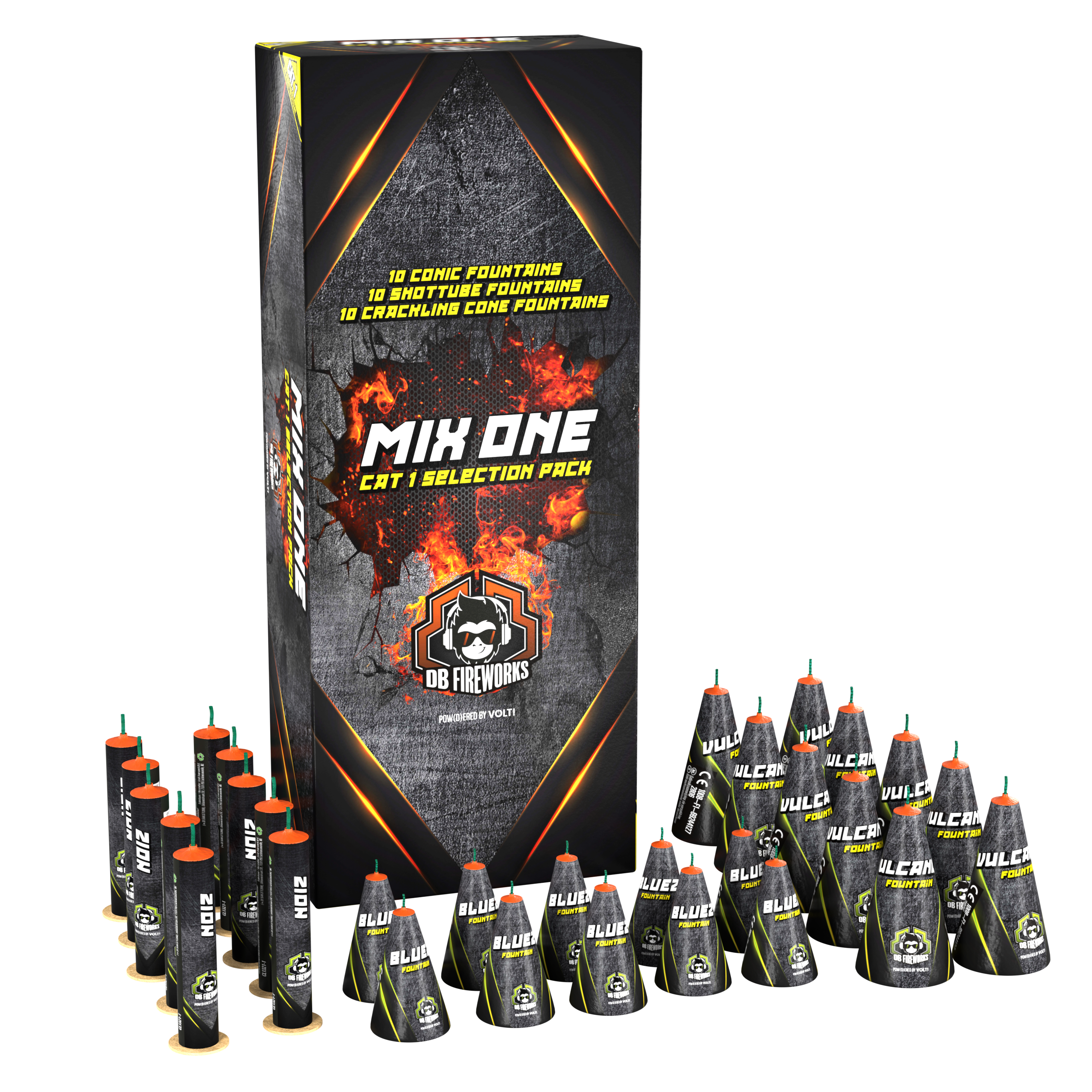 Mix One ist das perfekte Category 1 Selection Pack für alle, die auf der Suche nach sicherem, legalem und dennoch spektakulärem Feuerwerk sind. In diesem Set findest du 30 Fontänen, aufgeteilt in drei Typen: