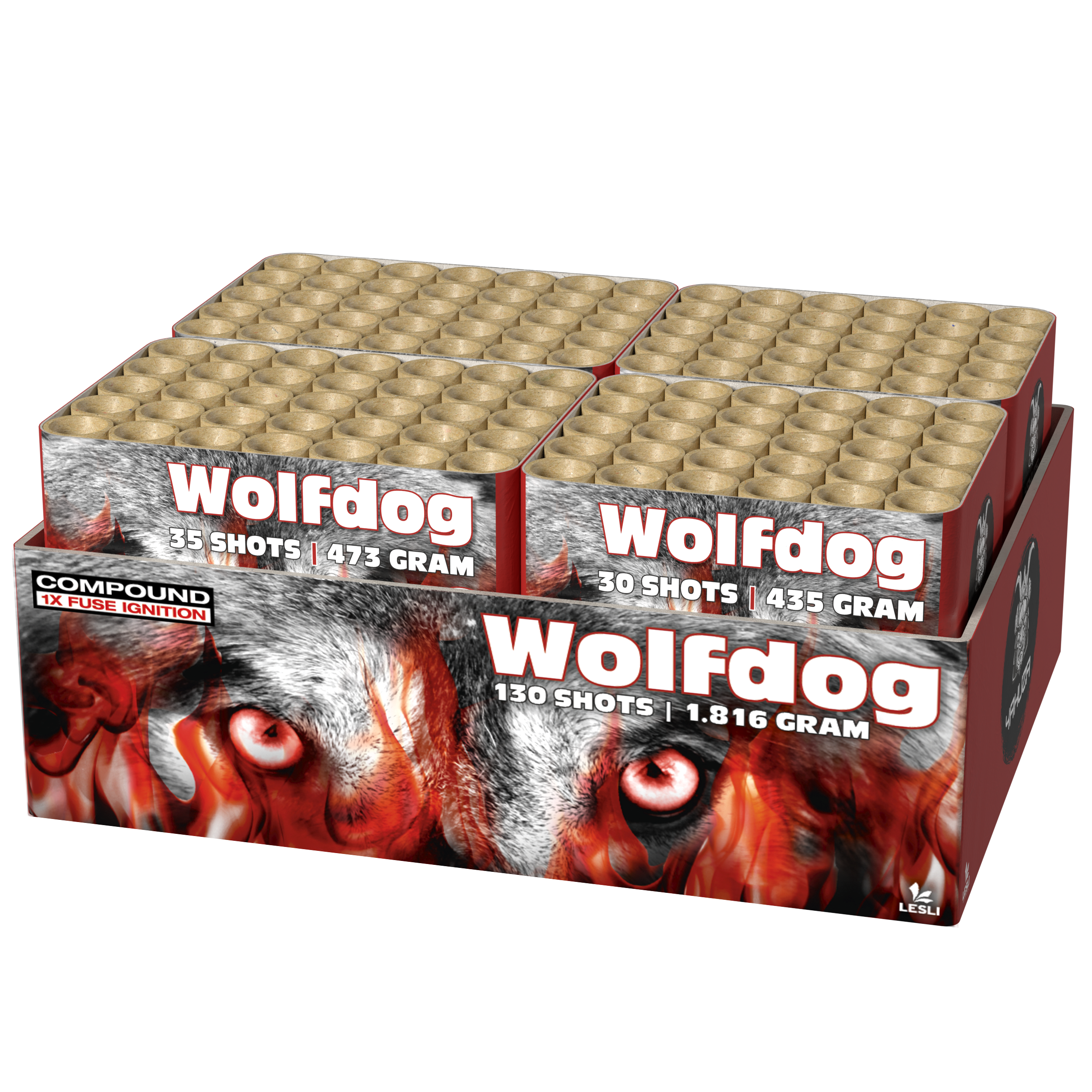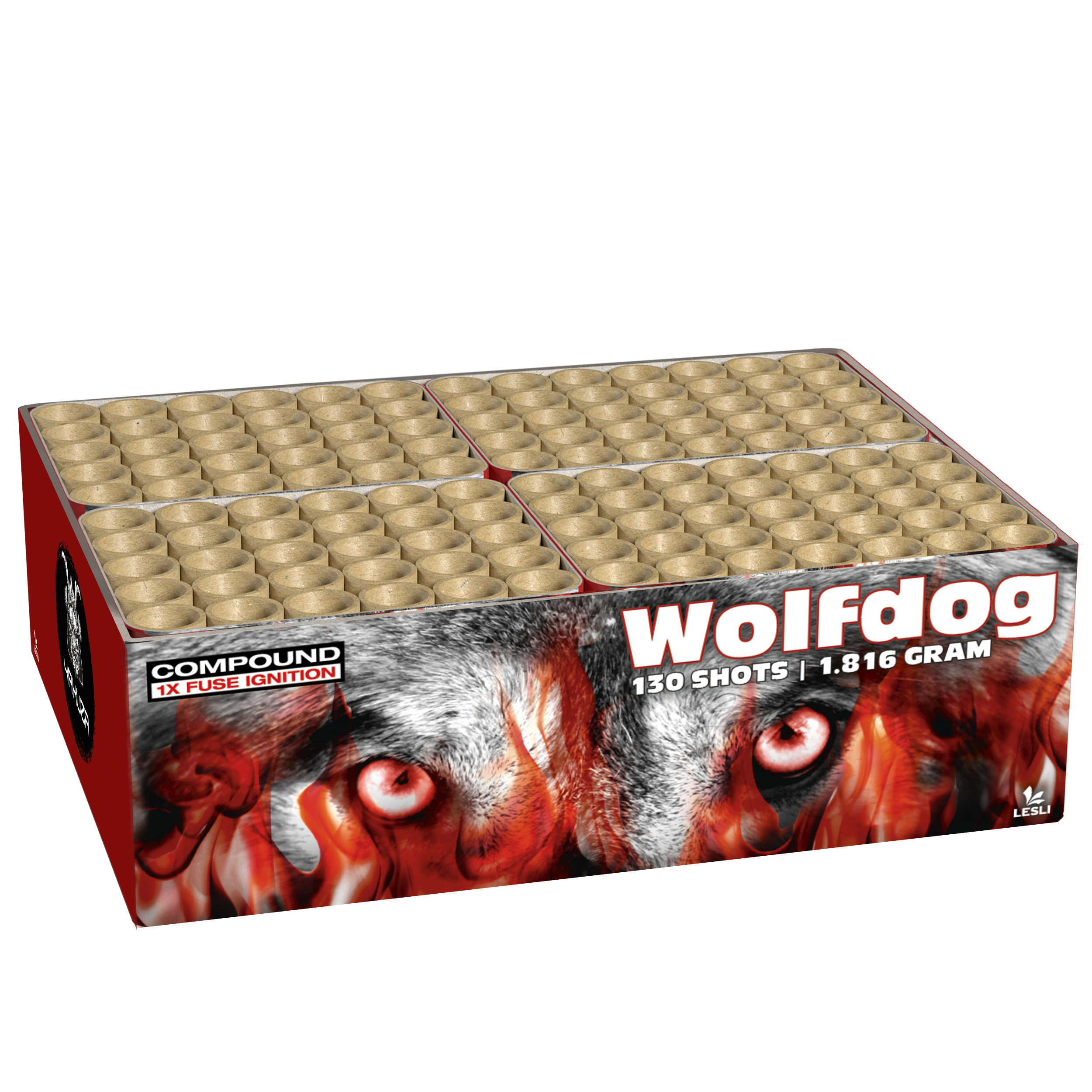 Wolfdog – 130 Schuss pures Feuerwerk-Chaos mit nur einer Zündung. 1816 g Effektkraft, perfekt für Shows mit Tempo, Power und Finale.